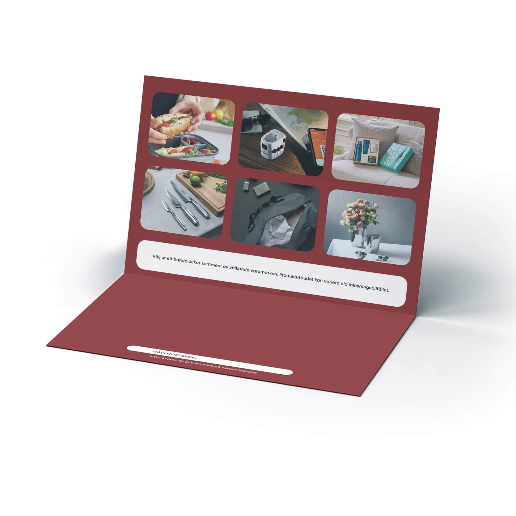 Gåvokort 240 kr ger mottagaren möjlighet att välja en personlig gåva ur ett stort sortiment fördelat över 14 olika kategorier.