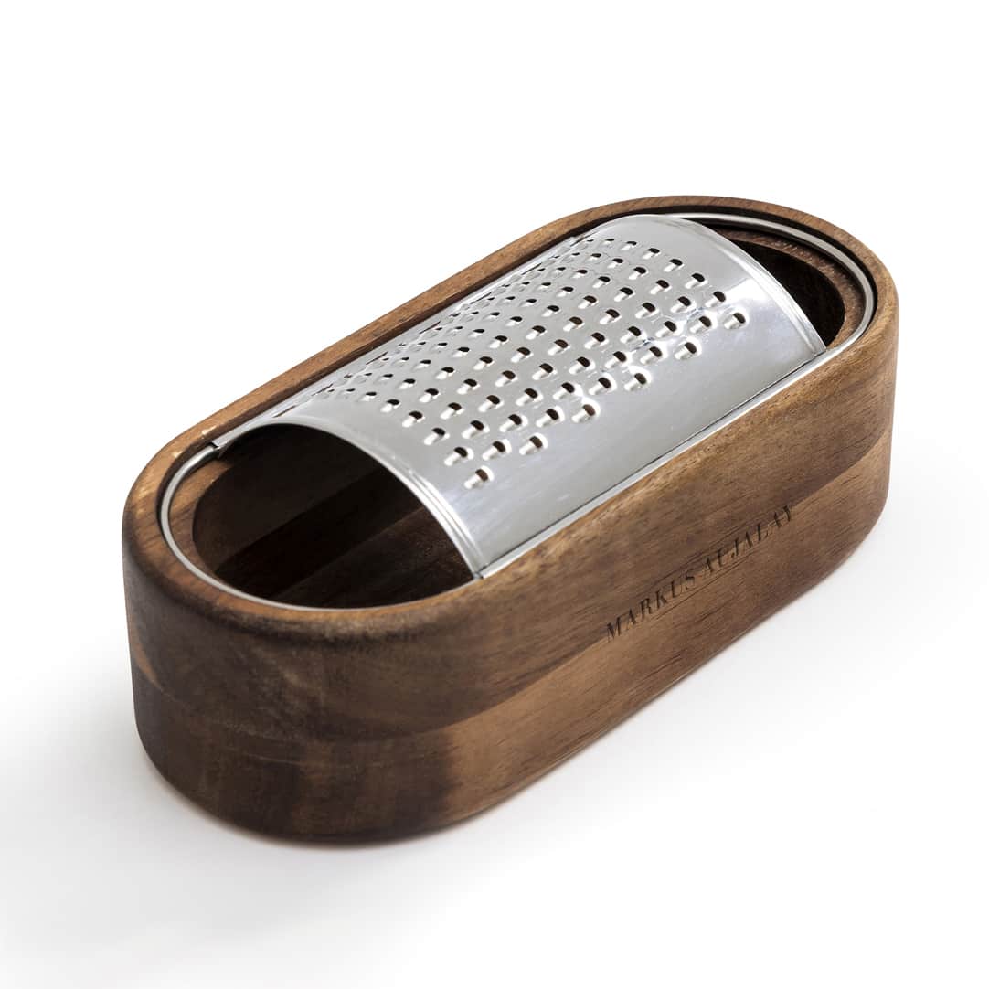Rivjärnet i stål, med en uppsamlare/behållare i acacia trä.